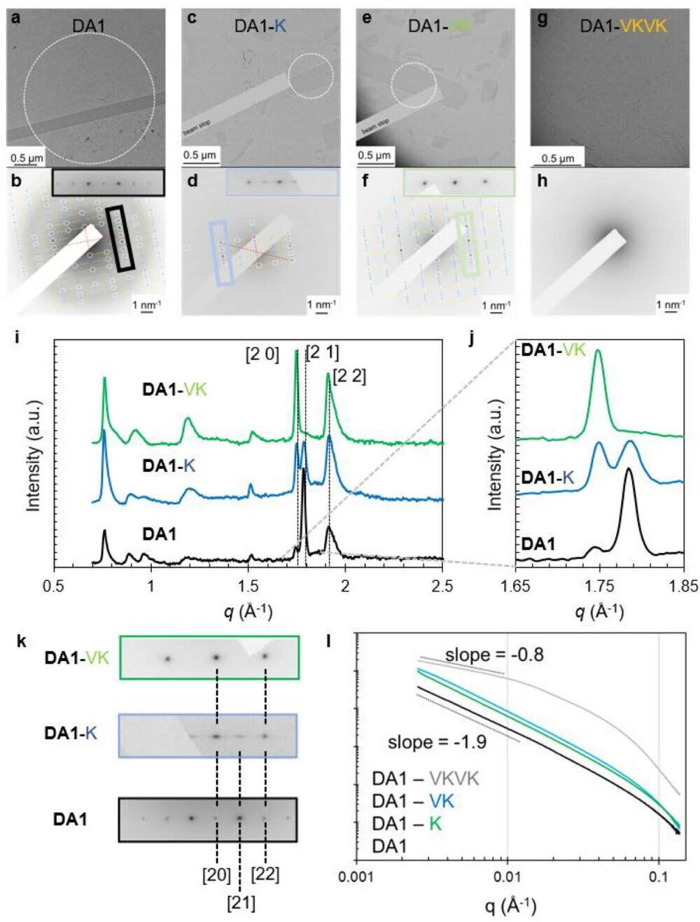 供体-受体肽两亲物的结构表征。a-h分别为DA1(a)、DA1-K(c)、DA1-VK(e)和DA1-VKVK(g)的透射电子显微照片;DA1(b)、DA1-K(d)、DA1-VK(f)和DA1-VKVK(h)的选区电子衍射图(白色虚线标示选区光阑,b、d和f插图为衍射图中相应彩色区域的放大图,红色虚线交叉点表示透射束位置)。i,j为含1当量NaOH的DA1水溶液、DA1-K及DA1-VK的广角X射线散射(WAXS)图谱,j中放大相关WAXS区域用于与电子衍射比对。k为从b、d、f中相应彩色框区域放大的SAED图。l为DA1-PA组装体水溶液(包括DA1黑色曲线、DA1-K绿色曲线、DA1-VK蓝色曲线和DA1-VKVK灰色曲线)的小角X射线散射(SAXS)图谱。