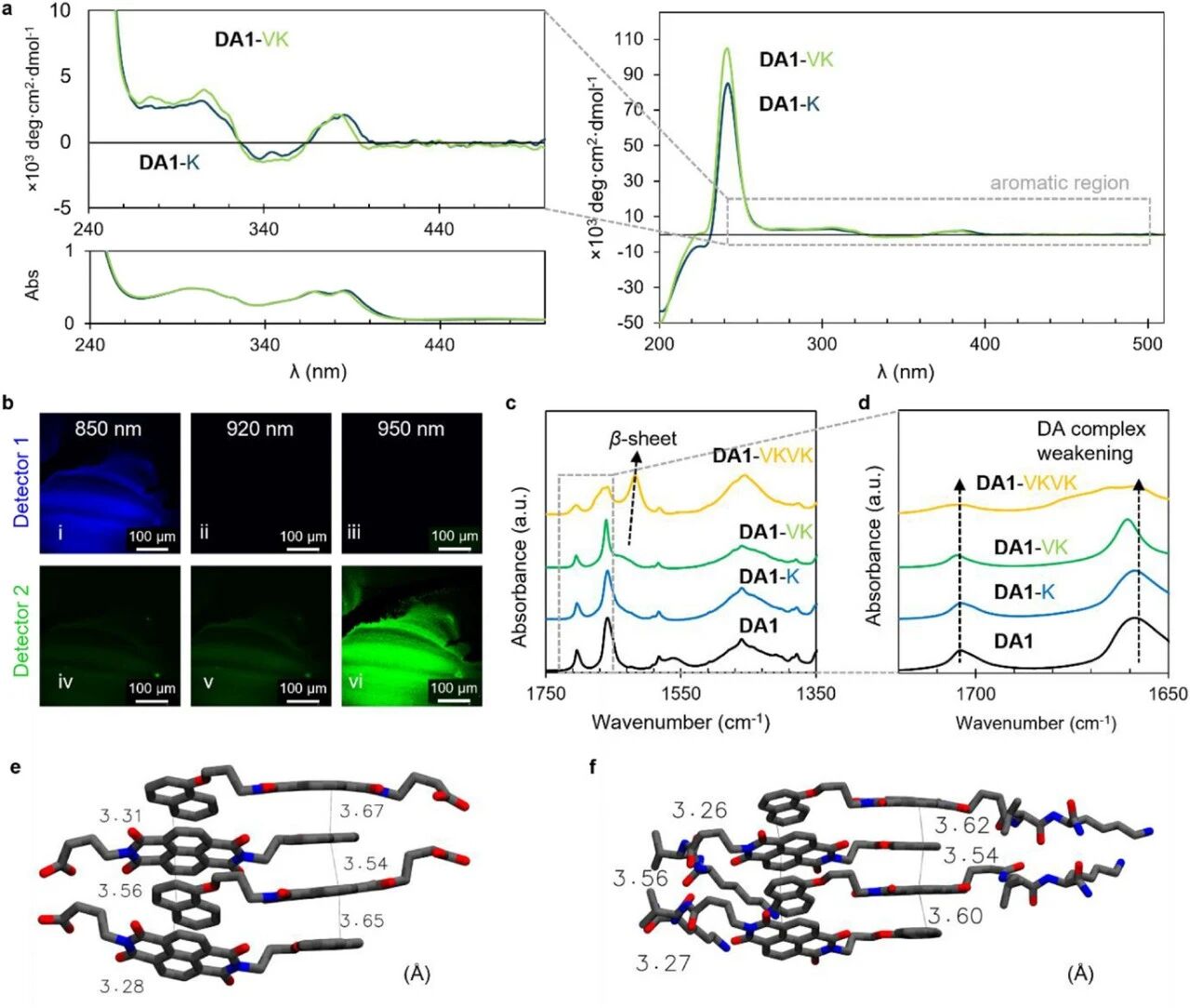 供体-受体肽两亲物晶格中的对称性破缺。a、DA1-K和DA1-VK水溶液在芳香区的圆二色光谱放大图(上)。图1e的紫外-可见吸收数据放大图作为对比添加(下)。b、DA1-VK干燥样品的双光子共聚焦显微镜图像。图i-iii对应检测器1(380-450 nm检测窗口),图iv-vi对应检测器2(470-550 nm检测窗口);图i和iv对应850 nm激发(仅能被检测器1成像),图ii和v对应920 nm激发(无法被这两个检测器成像),图iii和vi对应950 nm激发(仅能被检测器2成像)。c、d、含1当量NaOH的DA1水溶液(黑色迹线)、DA1-K(蓝色迹线)、DA1-VK(绿色迹线)和DA1-VKVK(橙色迹线)的红外吸收光谱。亚胺区的放大图显示DA1-VKVK中电荷转移相互作用减弱(d)。e、f、DFT优化结构显示DA1(e)和DA1-VK(f)中四个分子簇内的π-π堆积距离(单位Å)。