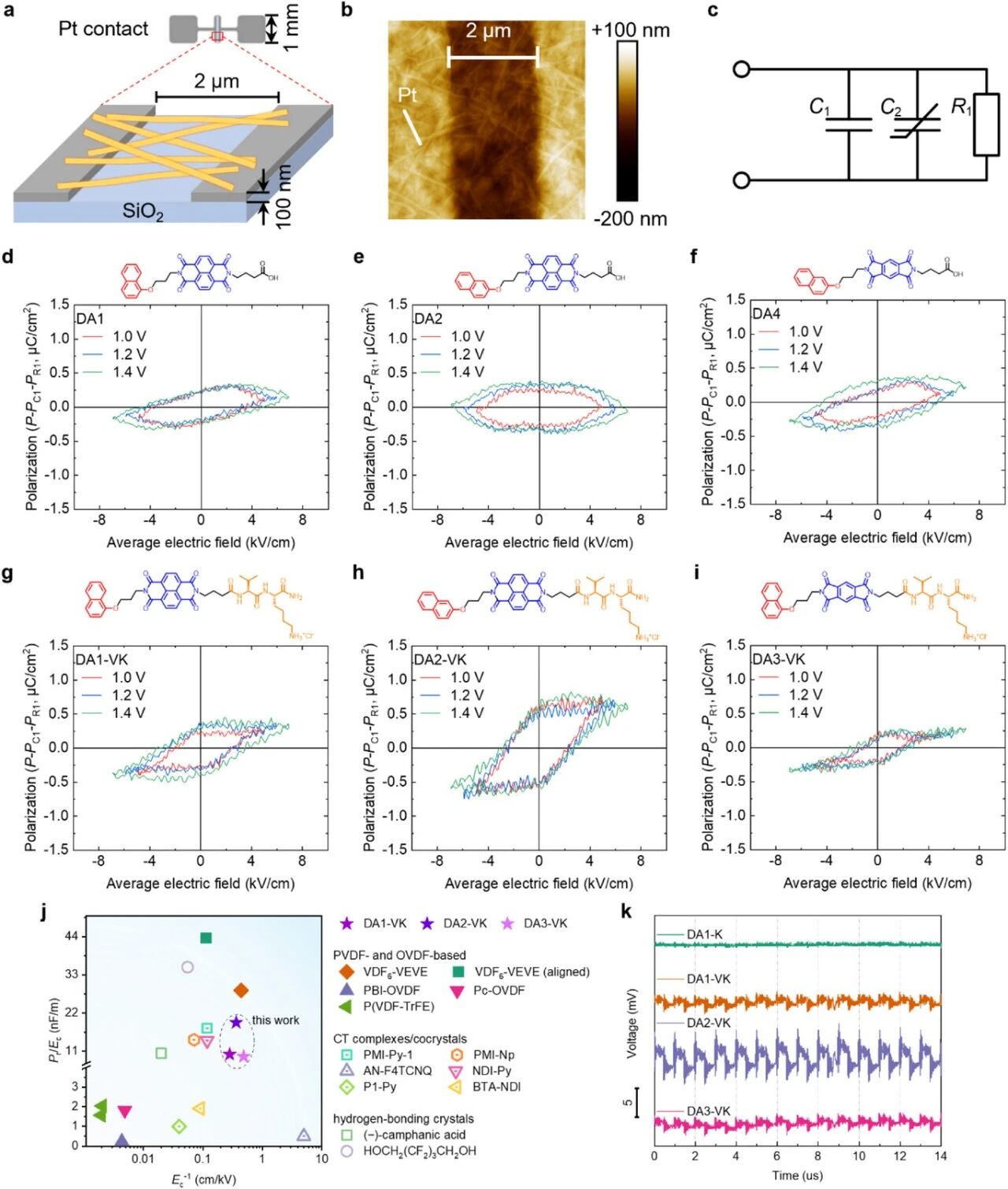 供体-受体肽类两亲分子纳米结构中的铁电性。a、铁电测试装置示意图。b、测试芯片上DA2-VK涂层的原子力显微镜图像。c、被测样品的等效电路图,包含与非线性电容器C2和电阻器R1并联的线性电容器C1。d-i、DA1(d)、DA2(e)、DA4(f)、DA1-VK(g)、DA2-VK(h)和DA3-VK(i)的P-E回线及相应分子结构示意图。j、铁电性DA-PA组装体与其他无金属室温有机铁电体的Pr/Ec与Ec−1关系对比(Pr和Ec数值及缩写定义见表S2)。k、超声刺激下DA-PA样品的压电电压波形(快速傅里叶变换分析见图S43)。(k)中电压曲线为清晰起见已垂直偏移。