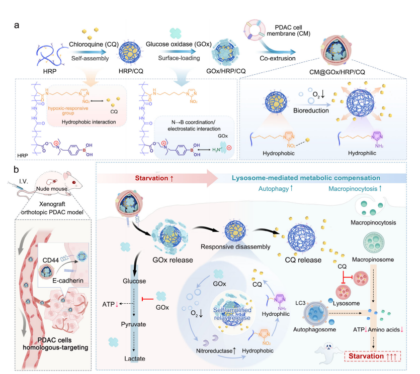 这篇研究报道了一种针对胰腺导管腺癌(PDAC)的新型自我放大纳米药物CM@GOx/HRP/CQ。该药物采用同源细胞膜伪装,能够主动靶向肿瘤并在缺氧环境下实现级联释放:先释放葡萄糖氧化酶GOx消耗葡萄糖、加剧缺氧,再触发氯喹CQ的爆发释放,从而阻断溶酶体依赖的营养回收通路。实验结果表明,该纳米药物在PDAC原位模型中表现出9.75倍的肿瘤富集增强、92.8%的肿瘤抑制率以及80%的生存率提升,且具有良好的生物安全性。