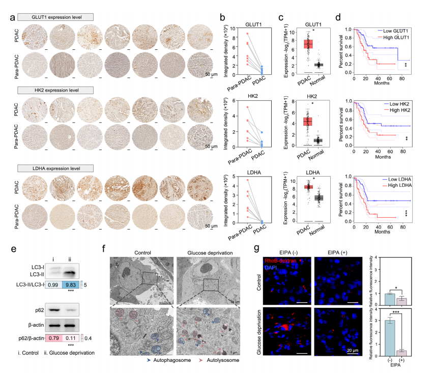 PDAC 中的糖酵解依赖与适应性代谢代偿。a) PDAC 患者肿瘤组织及邻近正常组织(PDAC 旁)中糖酵解相关酶(GLUT1、HK2、 LDHA)的代表性 IHC 染色。比例尺=50 µm 。b) IHC 染色定量分析(n=7)。c) TCGA 数据库中 PDAC 患者糖酵解相关基因的表达水平。d) 根据 TCGA 队列中糖酵解相关基因高/低表达水平分层的 PDAC 患者Kaplan-Meier生存分析。e) 正常喂养(对照组)或12小时禁食(葡萄糖剥夺)后荷 PDAC 小鼠LC3与p62的Western blot分析。f) 正常喂养(对照组)或12小时禁食(葡萄糖剥夺)后荷 PDAC 小鼠肿瘤切片中自噬泡的TEM图像。比例尺=1 µm 。g) 正常喂养(对照组)或12小时禁食(葡萄糖剥夺)后荷 PDAC 小鼠肿瘤组织中 CLSM 图像及RhoB-葡聚糖摄取实验评估的巨胞饮作用。比例尺=20 µm 。数据以均值±标准差表示。*P<0.05,**P<0.01,***P<0.001。