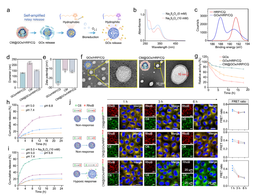 低氧响应性CM@GOx/ HRP /CQ的制备与表征。a) GOx和CQ在 PDAC 中自我放大传递以阻断葡萄糖成瘾和溶酶体依赖性适应性代谢补偿级联的示意图。b) HRP 在与或不与Na2S2O4(10 µm)孵育4小时后的紫外-可见吸收光谱。c) HRP /CQ和GOx/ HRP /CQ的 XPS 分析。d) 通过动态光散射测量的GOx/ HRP /CQ、CM和CM@GOx/ HRP /CQ的直径。e) GOx/ HRP /CQ、CM和CM@GOx/ HRP /CQ的Zeta电位。f) GOx/ HRP /CQ和CM@GOx/ HRP /CQ的TEM图像。比例尺 = 50 nm。g) 10% FBS(生理条件模拟)中游离GOx、GOx/ HRP /CQ和CM@GOx/ HRP /CQ的时间依赖性相对酶活性,归一化至初始值(100%)(n = 5)。h) 不同条件下CM@GOx/ HRP /CQ中GOx的体外释放曲线(n = 3)。i) 不同条件下CM@GOx/ HRP /CQ中CQ的体外释放行为(n = 3)。j) 用CM@ HRP /CQC6+RhoB、CM@GOx/ NRP /CQC6+RhoB、CM@GOx/ HRP /CQC6+RhoB处理的PANC-1细胞的FRET动力学图像和荧光比分析。荧光信号:C6(绿色),RhoB(红色)。比例尺 = 20 µm 。数据以均值 ± 标准差表示。