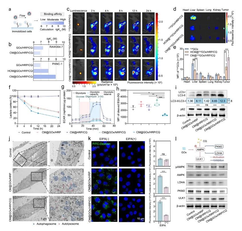 CM@GOx/ HRP /CQ的肿瘤靶向能力及级联代谢阻断机制。a) SPR分析示意图:将RAW264.7或PANC-1细胞固定于LIP-1传感器芯片上,随后注射不同纳米药物以评估结合亲和力。b) 不同纳米药物与RAW264.7或PANC-1细胞的结合亲和力。KD值采用1:1朗缪尔结合模型计算(n=4)。c) 通过Cy5通道分别在不同时间点对静脉注射Cy5GOx/ HRP /CQ、 HCM @Cy5GOx/ HRP /CQ及CM@Cy5GOx/ HRP /CQ的 PDAC 小鼠进行体内荧光成像。在初始时间点同步捕获BLI以定位原位Luc-PANC-1肿瘤。d) 注射Cy5GOx/ HRP /CQ、 HCM @Cy5GOx/ HRP /CQ和CM@Cy5GOx/ HRP /CQ后8小时,从携带 PDAC 的小鼠体内获取主要器官和肿瘤组织的Cy5通道离体荧光图像。e) 注射后8小时获取的主要器官和肿瘤组织中Cy5荧光强度的定量分析(n=3)。f) 经PBS(对照组)、CM@GOx/ HRP 、CM@ HRP /CQ、CM@GOx/ NRP /CQ和CM@GOx/ HRP /CQ处理0、4、8、12和24小时的PANC-1细胞胞外乳酸含量(n=5)。g) 经PBS(对照组)、CM@GOx/ HRP 、CM@ HRP /CQ、CM@GOx/ NRP /CQ和CM@GOx/ HRP /CQ处理的PANC-1细胞 ECAR 曲线,通过葡萄糖、寡霉素和2-脱氧-D-葡萄糖(2-DG)的序贯注射测定(n=5)。