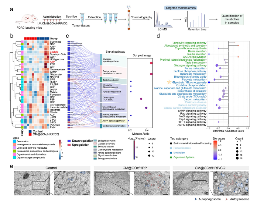 异种移植原位 PDAC 模型中CM@GOx/ HRP /CQ治疗后的代谢组学分析与自噬水平评估。a) 基于LC-MS的靶向代谢组学工作流程示意图。b) 经生理盐水(对照组)或CM@GOx/ HRP /CQ处理的荷瘤小鼠肿瘤组织中靶向代谢物的热图。数据经Z分数标准化(n=5)。c) 对照组与CM@GOx/ HRP /CQ组差异代谢物的通路富集分析,鉴定出10条显著富集的代谢通路,包括糖酵解/糖异生、丙酮酸代谢、三羧酸循环等。d) 显著富集代谢通路的DA分数分析。e) 分别经生理盐水(对照组)、CM@GOx/ HRP 及CM@GOx/ HRP /CQ处理的荷瘤肿瘤中自噬超微结构的透射电镜图像。自噬体特征为完整的胞质内容物与双层膜结构(蓝色箭头),自噬溶酶体则呈现降解内容物与单层膜结构(粉色箭头)。比例尺=1 µm