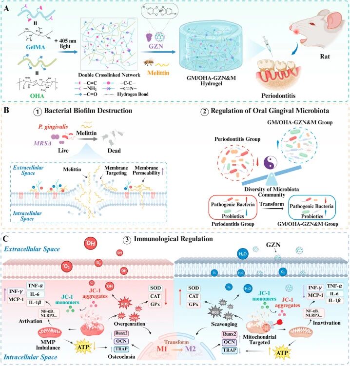 This article was published on December 13, 2025, in Bioactive Materials (Impact Factor 20.3), titled "Mitochondria-Targeted Injectable Hydrogel for Periodontitis Treatment via Oral Immunity and Microbiota Modulation." The study addresses the challenges of antibiotic resistance and microbial imbalance in periodontitis treatment by designing a novel injectable hydrogel platform named GM/OHA-GZN&M. This platform achieves antibiotic-free comprehensive periodontitis therapy by disrupting subgingival biofilms, remodeling the immune microenvironment, and regulating oral microbial balance. In vivo experiments showed that the hydrogel significantly inhibited inflammation and promoted alveolar bone regeneration, providing a new strategy for periodontitis treatment.