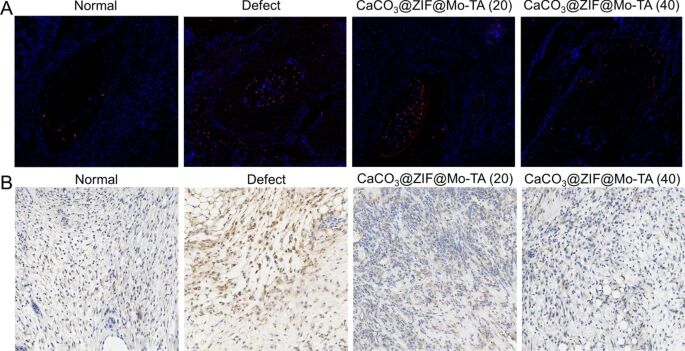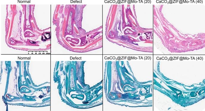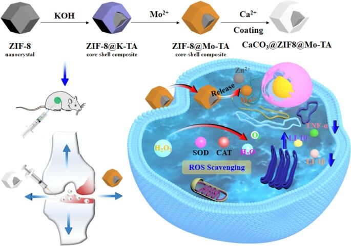 Osteoarthritis is a degenerative joint disease characterized by cartilage degeneration, subchondral bone remodeling, and chronic inflammation, and current treatments struggle to address its underlying mechanisms. In this study, a CaCO₃-coated ZIF-8 composite molybdenum nanozyme (CaCO₃@ZIF-8@Mo-TA) was constructed, and this nanomaterial was characterized using various techniques. Its therapeutic potential was then explored in an osteoarthritis rat model. The study found that this nanozyme can exert antioxidant and anti-inflammatory effects by regulating key signaling pathways, providing a new potential strategy for the treatment of osteoarthritis.