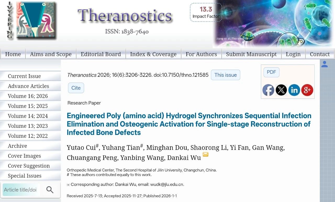 To address the treatment challenges of infectious bone defects, this study developed an engineered polyamino acid hydrogel with continuous antibacterial and osteogenic activation properties. Its role in infection control and bone defect repair was validated through in vitro and in vivo experiments, achieving single-stage reconstruction for this condition.
