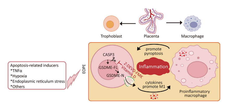 In the complex pathological mechanisms of early-onset preeclampsia (EOPE), the connection between apoptosis and inflammation has not been clearly elucidated. Recently, a study systematically analyzed clinical samples, various trophoblast models, and animal experiments, revealing that CASP3/GSDME-mediated trophoblast pyroptosis and its interaction with macrophage polarization constitute a key molecular loop driving placental and systemic inflammation in EOPE.