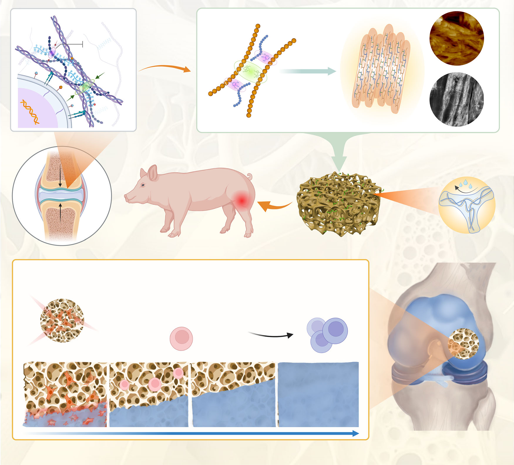 Microfracture surgery is a common clinical method for repairing articular cartilage defects, but the regeneration it induces is mostly fibrocartilage, which has poor mechanical properties and is prone to degeneration. The insufficient structural stability of the implanted material itself and the limited capability for endogenous activation may be key factors affecting effective cartilage regeneration after surgery. In natural cartilage, the collagen fiber network works synergistically with aggregates of proteoglycans, not only providing the tissue with good mechanical and lubricating properties, but more importantly, the collagen fibers can limit the excessive swelling of proteoglycans due to water absorption, thereby maintaining the structural stability of the matrix. However, this natural stabilization mechanism has not been adequately referenced or applied in previous designs of biomimetic artificial cartilage materials.
