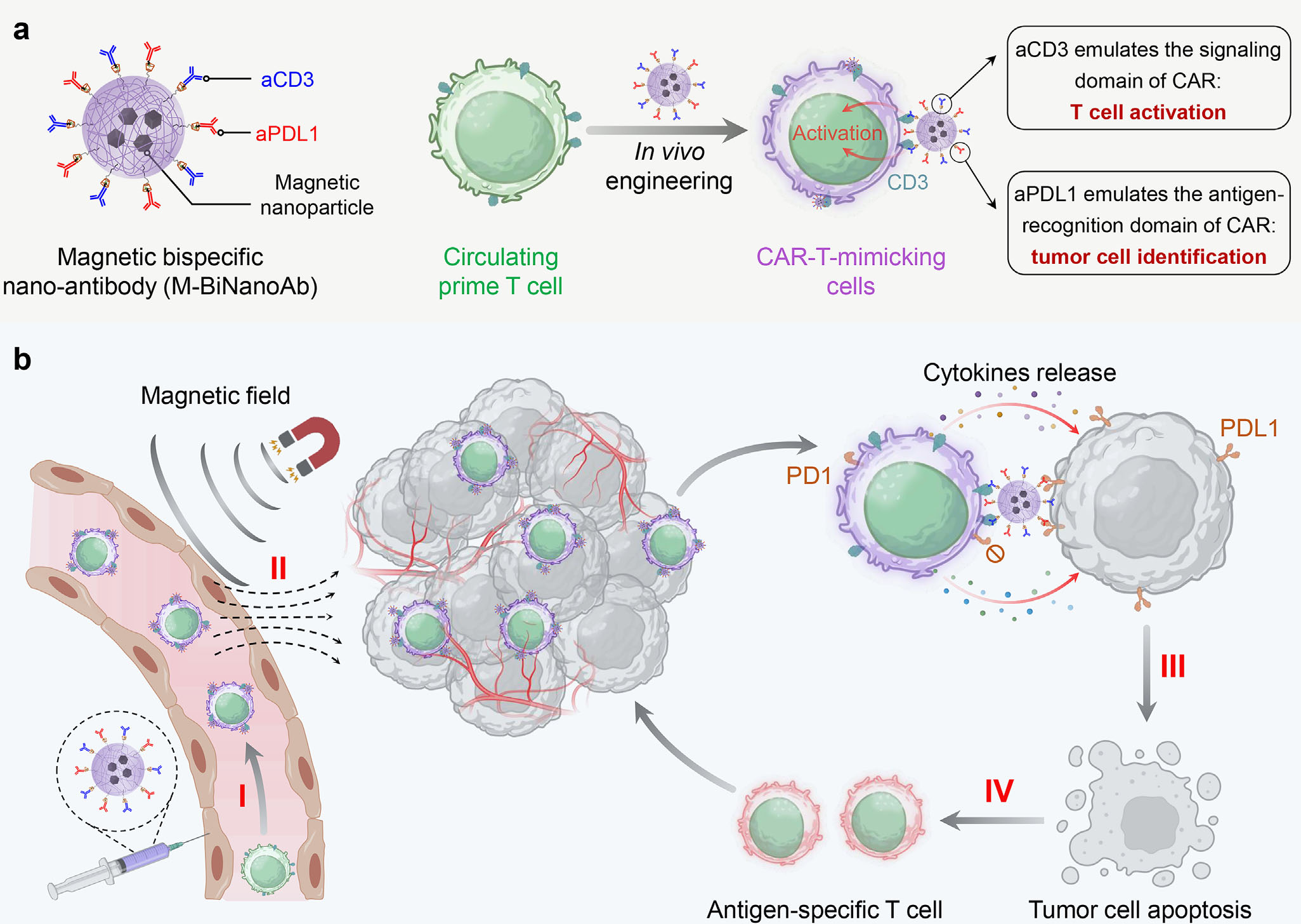 This study developed a magnetic bispecific nanobody (M-BiNanoAb) that can bind to circulating T cells in vivo via intravenous administration, transforming them in situ into CAR-T-like cells with targeting and killing functions. The nanobody surface is modified with both anti-CD3 and anti-PD-L1 antibodies, which mimic the signaling domain and antigen recognition domain of CAR structures, respectively, enabling T cells to specifically recognize and eliminate tumor cells with high PD-L1 expression.Crucially, with the guidance of an external magnetic field, these engineered cells can migrate directionally and effectively infiltrate solid tumors, significantly enhancing T cell accumulation and activation within the tumor microenvironment. In various preclinical models, such as melanoma and breast cancer, this strategy has demonstrated over 90% tumor suppression and can stimulate antigen epitope spreading and long-lasting immune memory, providing a new approach to immunotherapy for solid tumors that combines targeting, controllability, and potency.