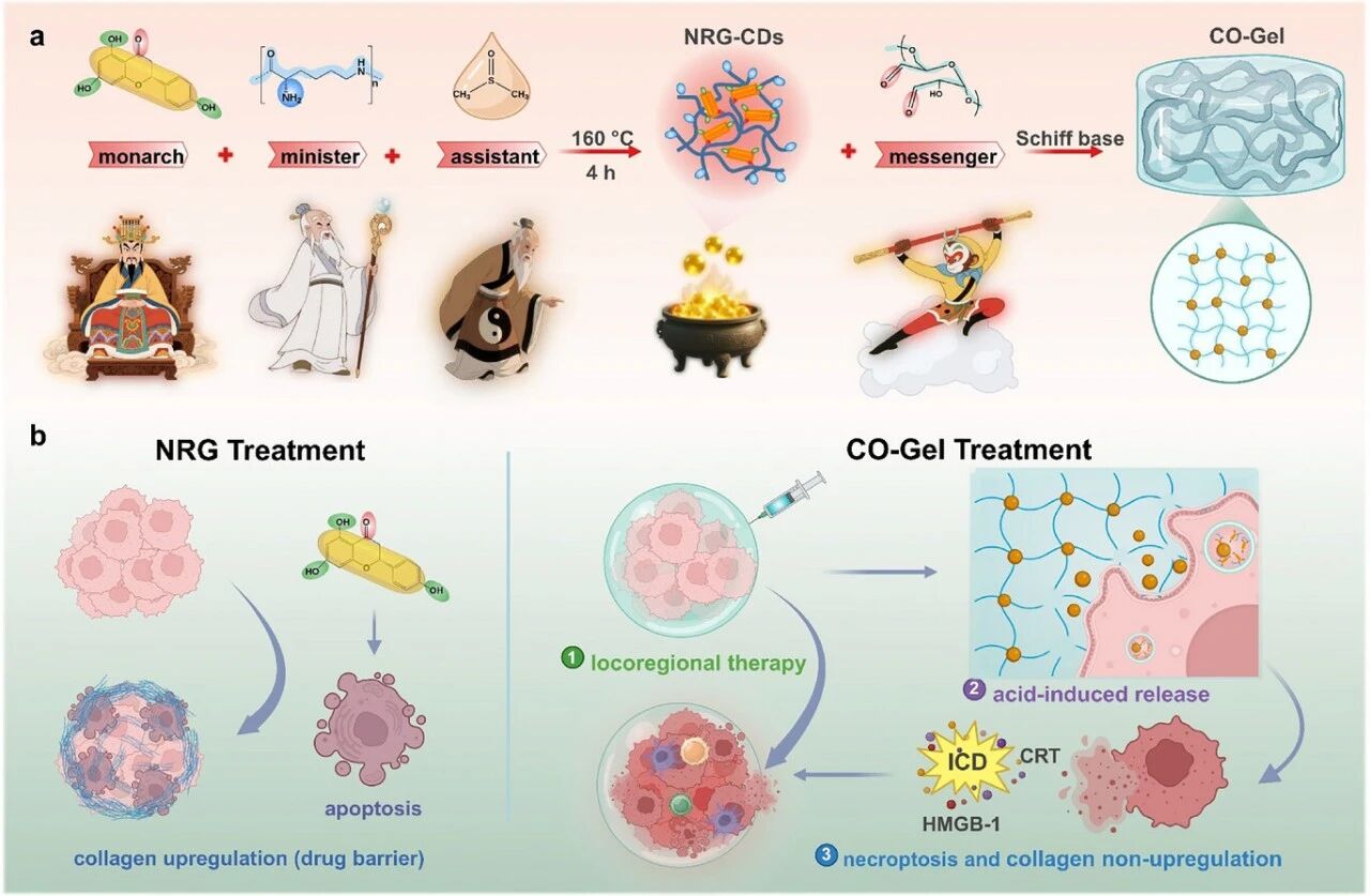 Solid tumors often develop drug resistance by obstructing drug penetration and immune cell infiltration through treatment-induced dense collagen barriers. Here, a traditional Chinese medicine-inspired carbon dot (NRG-CDs) system is reported, which reprograms cancer cell death from apoptosis to necroptosis, effectively eliminating the collagen barriers typically caused by drug-induced collagen upregulation while activating immunogenic cell death. By integrating naringenin (NRG) with ε-poly(L-lysine) through dimethyl sulfoxide-assisted solvothermal treatment, the resulting NRG-CDs achieve effective cancer cell killing while minimizing cytotoxicity to normal cells.Compared to NRG, NRG-CD shifts the mode of cell death from apoptosis to necroptosis, reduces collagen secretion, and simultaneously releases damage-associated molecular molecules to promote the maturation of antigen-presenting cells. Further incorporation of oxidized dextran can produce an injectable pH-responsive hydrogel (CO-Gel) that allows local release of NRG-CD in the acidic tumor microenvironment. In an aggressive mouse 4T1 model, peritumoral administration of CO-Gel achieved dual therapeutic outcomes: inhibition of primary tumors and suppression of lung metastasis. This strategy was further validated in an orthotopic liver tumor model in rats, demonstrating broad applicability. This work provides a paradigm shift from traditional cytotoxic drug design to the engineering of nanomedicines based on cell death modalities.