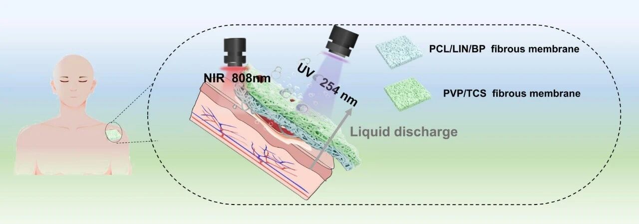 Wound dressings play a crucial role in the management and healing of all types of wounds, from minor cuts and chronic ulcers to severe burns. However, traditional dressings are often compromised by issues such as adhesion tendencies and insufficient barrier function. These limitations highlight the urgency of research into innovative wound dressings. This study uses electrospinning technology to composite polycaprolactone and polyvinylpyrrolidone into a bilayer film.Each layer is infused with different functional components—linalool, black phosphorus, and triclosan—to provide antibacterial and photothermal conversion effects, thereby meeting the standards for use as a wound dressing. Due to differences in the hydrophilicity of the materials, the bilayer membrane exhibits a certain interfacial energy difference between its two sides, allowing liquid to be discharged from one side to the other.The results show that the prepared bilayer exhibits excellent antibacterial effects and good biocompatibility, as well as outstanding photothermal effects and unidirectional hydrophobicity. The currently obtained multifunctional composite film has been successfully prepared by integrating a combination of antibacterial, photothermal, and asymmetric wettability properties, providing a new approach for the development of wound dressings.