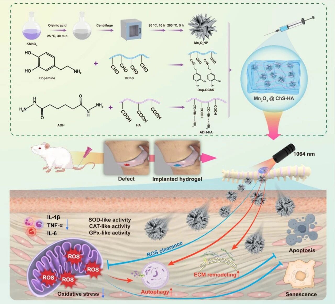 Annular fibrotic (AF) damage plays a key role in intervertebral disc degeneration (IVDD), with oxidative stress and extracellular matrix (ECM) imbalance being major pathogenic factors. However, effective repair methods are limited. This study developed an injectable photothermal hydrogel Mn3O4@ChS-HA, composed of dopamine-grafted chondroitin sulfate (dop-OChS), adipic dihydrazide-modified hyaluronic acid (ADH-HA), and Mn3O4 nanoparticles,to repair AF damage. Mn3O4@ChS-HA mimics the native intervertebral disc environment, exhibiting excellent mechanical properties and strong adhesion to AF defect sites, while also supporting the long-term retention of Mn3O4 nanoparticles. Mn3O4 nanoparticles demonstrate catalytic characteristics similar to superoxide dismutase, catalase, and glutathione peroxidase, effectively scavenging reactive oxygen species and regulating ECM metabolism. In vitro and in vivo studies have shown that Mn3O4@ChS-HA significantly inhibits cell apoptosis,Delays cellular aging, reduces inflammation, promotes autophagy, and facilitates atrial fibrillation repair. The hydrogel can also restore intervertebral disc height and maintain ECM integrity in a rat model of atrial fibrillation injury. Mild photothermal therapy (MPTT) further enhances these effects, supporting tissue regeneration and delaying the progression of IVDD. The MPTT-nanozyme-hydrogel system Mn3O4@ChS-HA exhibits multiple biological functions by regulating redox homeostasis and promoting tissue repair, highlighting the potential of this approach as a promising strategy for IVDD treatment.