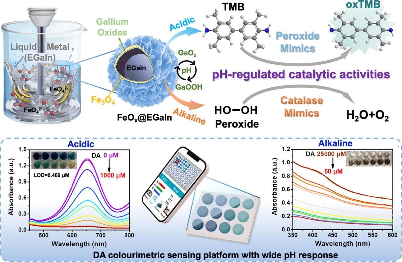 Liquid metals (LMs) possess unique reversible morphologies and tunable electronic properties, making them a promising platform for designing advanced nanozymes. The catalytic activity of nanozymes is often highly dependent on the environmental pH. In this study, a magnetic LM-buffered iron oxide nanozyme (FeOx@EGaIn) with pH-switchable enzyme activity was designed, where the LM serves as an electron transfer substrate, effectively enhancing catalytic efficiency. Due to the different oxidation forms and local electronic properties of iron oxide in acidic and alkaline systems,FeOx@EGaIn nanozyme exhibits excellent peroxidase (POD) catalytic activity under acidic conditions (Km = 2.12 mM, vmax = 1.96 × 10−6 M s−1), and converts to catalase (CAT) activity under neutral to alkaline conditions, showing high catalytic stability. Its unique magnetic responsiveness also provides a more convenient possibility for catalyst recovery.In addition, the switchable enzyme activity of nanozymes provides new avenues for biosensing applications, especially in the detection of a wide range of pH-responsive biomolecules. Using liquid metal nanozymes as a colorimetric sensing platform for dynamic detection of biomolecules reveals the key role of the electronic microenvironment in regulating nanozyme catalytic activity and also expands the potential applications of liquid metals in catalysis, sensing detection, and the biomedical field.
