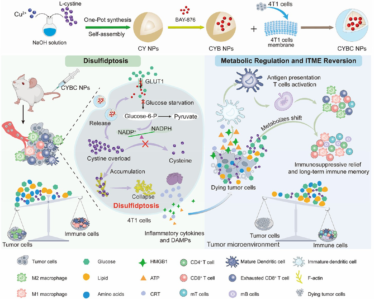 Malignant tumor metabolic reprogramming drives proliferation and immune evasion by hijacking essential nutrients and shaping an immunosuppressive microenvironment. Although targeting tumor metabolism offers therapeutic prospects, selectively modulating abnormal metabolic pathways without affecting normal cells remains a significant challenge. Disulfidation is a recently discovered form of metabolism-dependent regulated cell death that may provide a route for metabolic disruption; however, its immunoregulatory potential has yet to be explored.This study designed a disulfide-containing nano-inducer (CYBC NPs), a nanoplatform co-loading cystine and the GLUT1 inhibitor BAY-876, camouflaged with a cancer cell membrane, which selectively induces disulfide stress in triple-negative breast cancer cells. By simultaneously blocking glucose uptake and supplying cystine, CYBC NPs trigger disulfide-mediated cytoskeletal collapse, reprogram tumor metabolic flux, and induce immunogenic cell death. This metabolic perturbation promotes dendritic cell maturation, M1-like macrophage polarization, and activation of cytotoxic T lymphocytes.Thus, ITME is reversed and tumor growth is suppressed. Notably, CYBC NPs trigger a strong, non-exhausted anti-tumor immune response and generate lasting immune memory, effectively preventing tumor recurrence and metastasis. In summary, our study demonstrates the implementation of disulfide as an independent immunotherapy strategy, providing a paradigm shift for metabolism-driven cancer immunotherapy.
