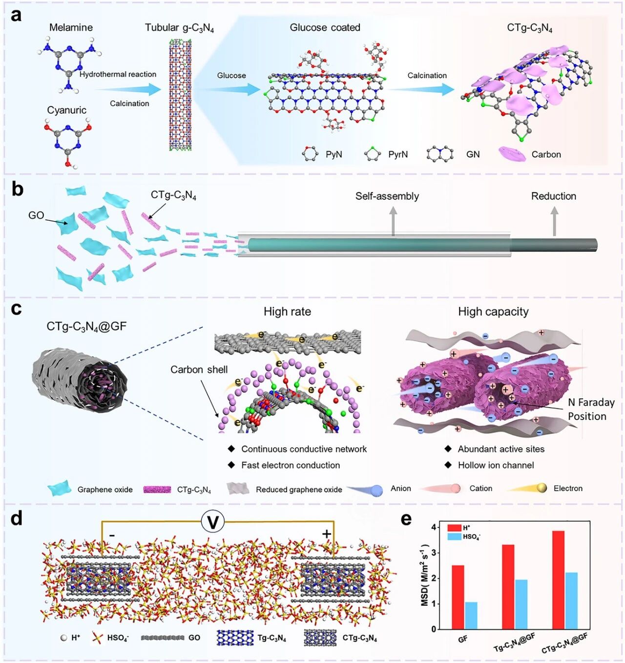 Fiber-based supercapacitors (FSCs) have attracted widespread attention for wearable applications and smart societies due to their high wearability, deformable energy supply, and safety and stability. However, due to the low porosity, active sites, and charge transfer of fibers, the capacity and rate performance of FSCs are both unsatisfactory. This article reports a novel heterostructured carbon-coated tubular carbon nitride embedded graphene fiber (CTg-C3N4@GF) for high-performance FSCs.The CTg-C3N4@GF electrode exhibits an extremely high areal capacitance (3,648 mF cm−2) and rate capability (2,488 mF cm−2 at 50 mA cm−2). In addition, the assembled solid-state FSC can also provide high energy density (296.2 μWh cm−2), cycling stability, and applications in wearable energy supply (for powering clocks and wearable starlight devices).The key to high performance lies in the electronic transfer of the carbon coating; nitrogen materials create abundant active sites, and the hollow nanotubes enhance transport pathways, achieving high ion absorption capacity, low ion diffusion resistance, improved conductivity, fast charge transfer kinetics, and excellent electrochemical reversibility.