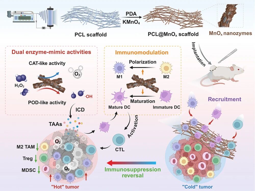 Surgical resection remains the first-line treatment for solid tumors. However, postoperative recurrence driven by residual tumor cells and an immunosuppressive microenvironment continues to challenge long-term patient survival. This study proposes an implantable fibrous scaffold functionalized with MnOx nanozymes to prevent tumor recurrence. The dual enzyme-mimicking activity of MnOx nanozymes endows the scaffold with immunomodulatory functions. On one hand, the peroxidase-like activity of MnOx nanozymes catalyzes the production of cytotoxic hydroxyl radicals, thereby triggering immunogenic cell death and antigen release.On the other hand, its catalase-like activity helps alleviate hypoxia by decomposing H₂O₂ to generate O₂, thereby reprogramming macrophages into a pro-inflammatory M1 phenotype. At the same time, the released Mn²⁺ ions can act as an effective immune adjuvant, promoting the recruitment and activation of immune cells. This synergistic immune-regulating cascade allows the scaffold to establish a persistent local immune microenvironment.Both in vitro and in vivo evaluations have confirmed that this MnOx-functionalized scaffold can trigger a robust antitumor immune response and effectively prevent postoperative recurrence without the need for exogenous immune stimulants. This work highlights a material-based immunotherapy strategy that leverages the inherent catalytic and immunomodulatory properties of nanozymes to design bioactive scaffolds for postoperative cancer treatment.