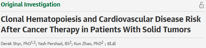 Cardiovascular disease (CVD) is the leading cause of non-cancer death among cancer survivors, and chemotherapy and immunotherapy increase this risk. Clonal hematopoiesis of indeterminate potential (CHIP), an age-related phenomenon, independently increases the risk of CVD when somatic mutations in pre-leukemic genes are present in 4% or more of peripheral blood nucleated cells. Since patients with solid tumors exhibit a higher prevalence of CHIP compared to age-matched controls,Understanding whether CHIP amplifies treatment-related cardiovascular toxicity has direct clinical implications for risk stratification and monitoring strategies in cancer survivors. We hypothesize that CHIP is associated with an increased risk of cardiovascular disease in patients receiving cardiotoxic cancer treatments. Since cumulative exposure to cancer treatment is an important determinant of cardiotoxicity, we further hypothesize that CHIP may amplify this risk, with more pronounced effects in individuals with higher cumulative chemotherapy exposure.