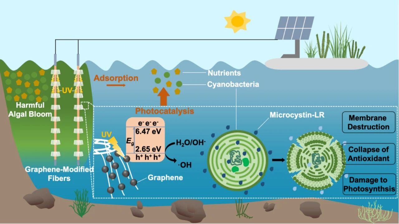 Photocatalytic technology faces challenges in practical applications, such as difficulty in recovering catalysts and the potential for secondary pollution caused by powdered photocatalysts, which limits its promotion in the control of harmful algal blooms. In this study, graphene was in situ polymerized onto the surface of polyester fibers to successfully develop graphene-modified fibers (GMF) as a photocatalyst, and applied to the inactivation and control of cyanobacterial blooms. Under ultraviolet irradiation, GMF exhibited stable photocatalytic performance, continuously inhibiting the growth of Microcystis aeruginosa (with an inhibition rate of 56.4%) and degrading 18.4% of microcystin-LR. The strong oxidative stress induced by GMF led to cellular structural damage and inhibition of photosynthetic activity.At the same time, it enhances the activity of antioxidant enzymes and the levels of non-enzymatic antioxidants. GMF absorbs sufficient energy to induce interband transitions, generating hydroxyl radicals that directly participate in intracellular redox reactions. Although the graphene component has an adsorption effect on nitrogen and phosphorus, studies have confirmed that the photocatalytic pathway is the dominant mechanism for inhibiting algal growth and degrading algal toxins. In continuous flow reactors and pilot-scale enclosed experiments,A 0.2% concentration of GMF inhibited the growth of cyanobacteria by 61.5%–92.2%. These results indicate that GMF provides a green and efficient solution for the control of harmful algal blooms and the simultaneous removal of algal toxins, laying a forward-looking foundation for the practical application of graphene-based photocatalytic materials in environmental management.
