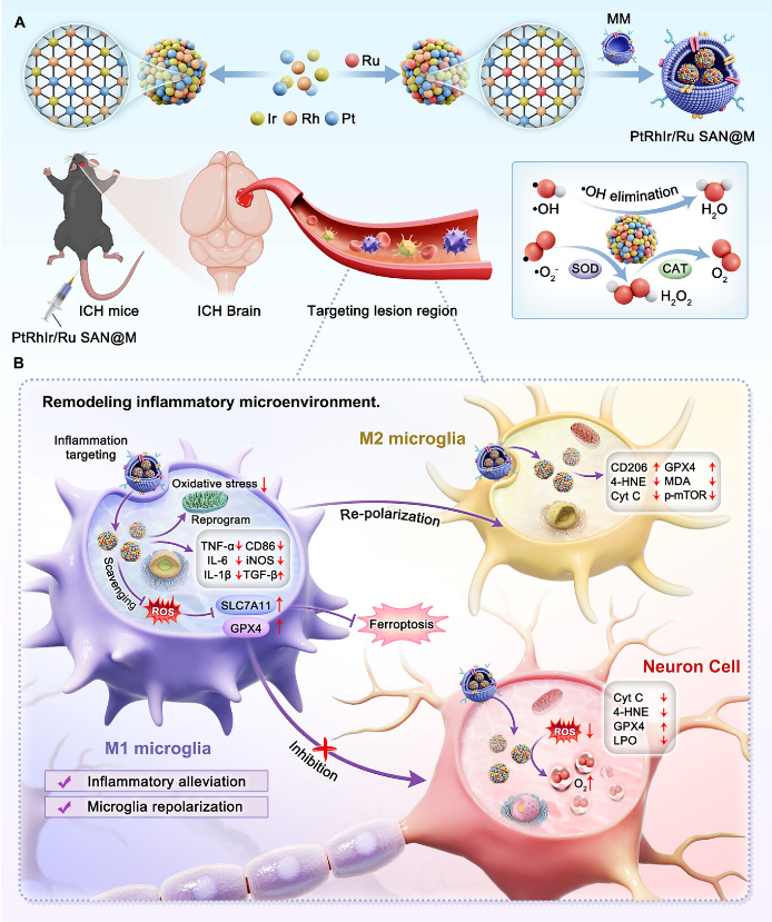 Intracerebral hemorrhage (ICH) causes severe secondary brain injury (SBI) through excessive inflammation and reactive oxygen species (ROS), and current treatments lack effective dual-target efficacy. In this study, we designed a microglial cell membrane-coated single-atom nanozyme (PtRhIr/Ru SAN@M) by anchoring a Ru atom on an ultra-small, medium-entropy PtRhIr alloy. This design integrates two underutilized strategies—single-atom nanozymes (SANs) and medium-entropy catalysts.To address the critical therapeutic gap in ICH treatment. PtRhIr/Ru SAN@M, based on electronically modulated active sites, has superior hydroxyl radical (•OH) scavenging capacity and exhibits superoxide dismutase (SOD)- and catalase (CAT)-like activity, all outperforming PtRhIr@M. Fluorescence imaging confirmed that it can penetrate the blood-brain barrier (BBB) and accumulate in neuroinflammatory regions after ICH. Both in vitro and in vivo experiments indicate that PtRhIr/Ru SAN@M repolarizes microglia from the M1 to the M2 phenotype, disrupts the neuroinflammatory cycle, and prevents neuronal death.Therapeutic intervention with PtRhIr/Ru SAN@M significantly improved survival rates, restored neurological function, and enhanced spatial memory after ICH. This study pioneeringly integrates SANs with medium-entropy alloys for ICH, providing a dual-target ROS inflammation regulation strategy and a potentially translatable platform for treating ROS-related degenerative diseases.
