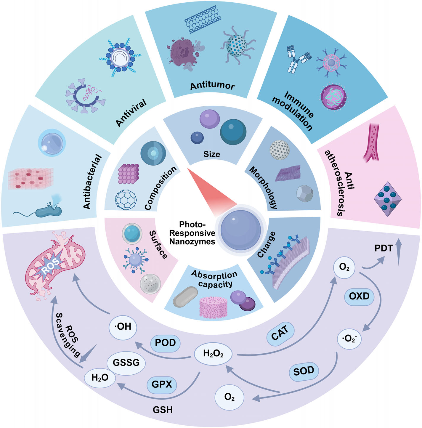 Nanozymes have been attracting increasing attention due to their high stability, low cost, and scalable synthesis. However, their clinical potential is often limited by relatively low catalytic efficiency and poor substrate specificity. Recent developments in light-responsive nanozymes offer promising solutions by integrating photocatalytic and photo-assisted mechanisms to enhance activity and spatiotemporal control. These systems improve catalytic performance through light-induced charge separation, generation of reactive oxygen species, and auxiliary photothermal or photodynamic effects.By leveraging these light-responsive mechanisms, various nanozyme systems, including plasmonic metals, metal oxides, semiconductors, and metal-organic frameworks, demonstrate enhanced catalytic functions and outstanding therapeutic effects in cancer treatment, infection control, immune modulation, and tissue repair. This review summarizes the latest advances in the design and application of light-responsive nanozymes and highlights the challenges in clinical translation, positioning them as next-generation strategies for precise biocatalysis and disease intervention.