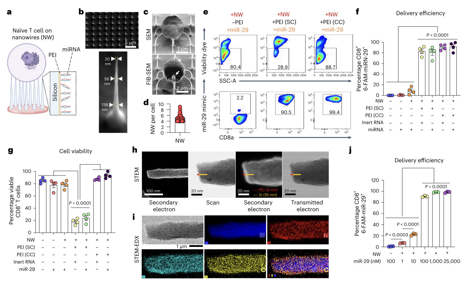 Recently, Ankur Singh et al. reported a nanowire technology that is used to deliver miRNAs to T cells for programming, thereby enhancing anti-tumor efficacy. The research team used cationic polymer-functionalized nanowires to deliver single or multiple microRNAs (miRNAs) to the initial CD8+ T cells without pre-activating the T cells. The cellular programming of the initial T cells can improve the efficacy of adoptive T cell therapy. However, the current in vitro engineering of T cells requires pre-activation of T cells, which causes them to lose their original state. In this study, the authors used functionalized nanowires to program the fate of the initial CD8+ T cells for in vivo therapeutic responses. This was accomplished by delivering single or multiple microRNAs to primary mouse and human CD8+ T cells without pre-activation. The combination of miRNAs delivered through nanowires programmed CD8+ T cells, regulating their adaptability through changes in T cell proliferation, phenotype, and transcriptional regulation, and the secretion of effector molecules. Additionally, the intravenous transfer of engineered mouse CD8+ T cells through nanowire-mediated dual miRNA delivery provided enhanced immune protection against different intracellular pathogens. In vivo analysis showed that simultaneous changes in miR-29 and miR-130 levels in the initial CD8+ T cells reduced the persistence of typical memory T cells while increasing the number of short-lived effector T cells. Nanowires have the potential to be used to regulate CD8+ T cell differentiation and achieve therapeutic responses in vivo without pre-activation.