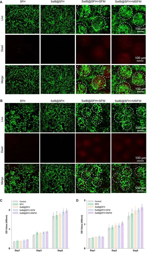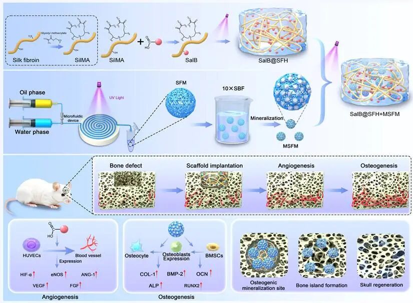 This study investigated a time-functional composite hydrogel scaffold for cranial defect repair, which can promote the regeneration of vascularized bone by sequentially regulating angiogenesis and osteogenesis. Traditional bone repair materials often serve as inert fillers and are difficult to dynamically coordinate the timing of different biological events during bone regeneration. This study addresses this challenge,Designed a composite hydrogel system based on silk fibroin