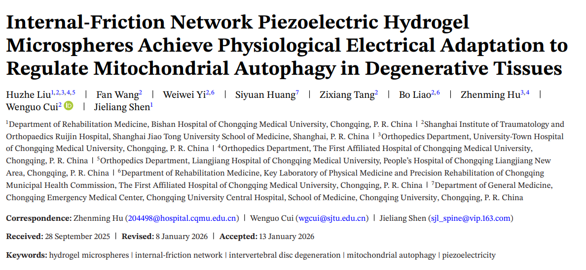 For degenerative tissue diseases such as intervertebral disc degeneration, one of the core pathological mechanisms lies in cell apoptosis and energy metabolism disorders caused by an imbalance in mitochondrial autophagy. The loss of endogenous electrical signals in degenerated tissues further exacerbates the decline in cellular function. Recently, a study published in Advanced Materials proposed an innovative intrafriction network piezoelectric hydrogel microsphere system, which provides a new approach for intervening in degenerative changes by restoring the physiological electrical adaptation of tissues.