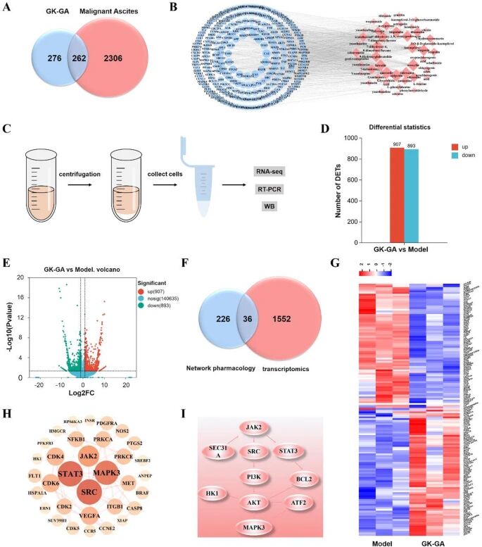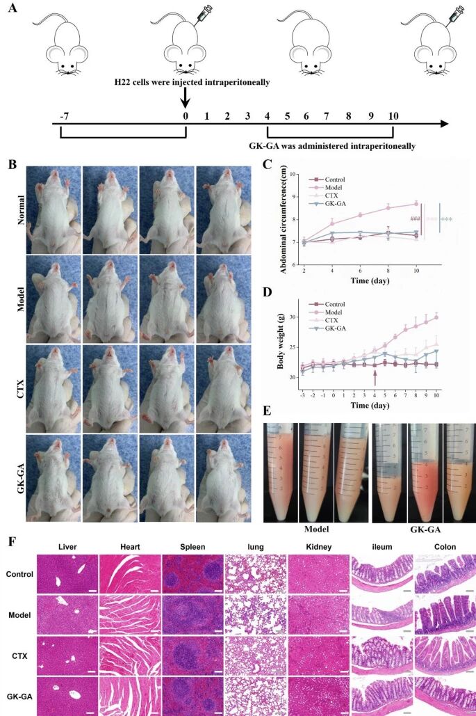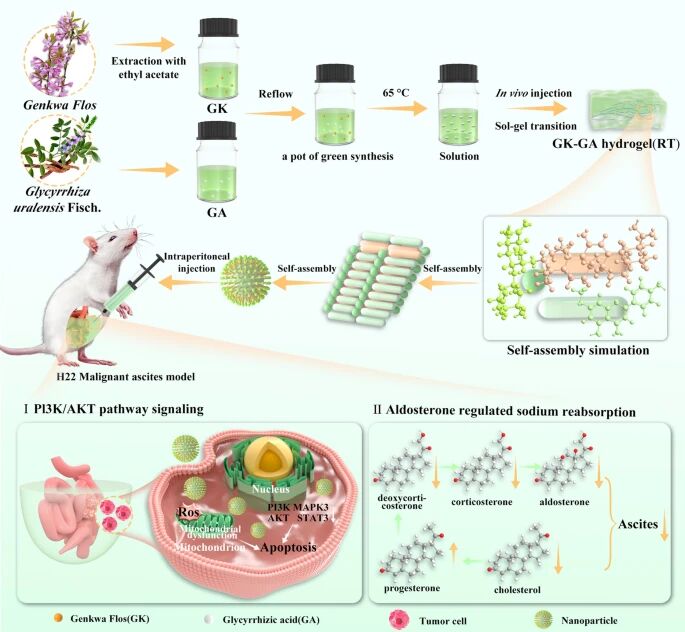 This study investigated an injectable multi-component hydrogel (GK-GA) formed through green self-assembly of the active fraction of the traditional Chinese medicine Genkwa Flos (GK) and Glycyrrhizic Acid (GA), for the treatment of malignant ascites (MA) caused by hepatocellular carcinoma (HCC). The hydrogel achieves localized, long-lasting retention through intraperitoneal injection and combines the dual effects of inducing tumor cell apoptosis and regulating metabolism, providing a new approach for targeted therapy of liver cancer-associated ascites.