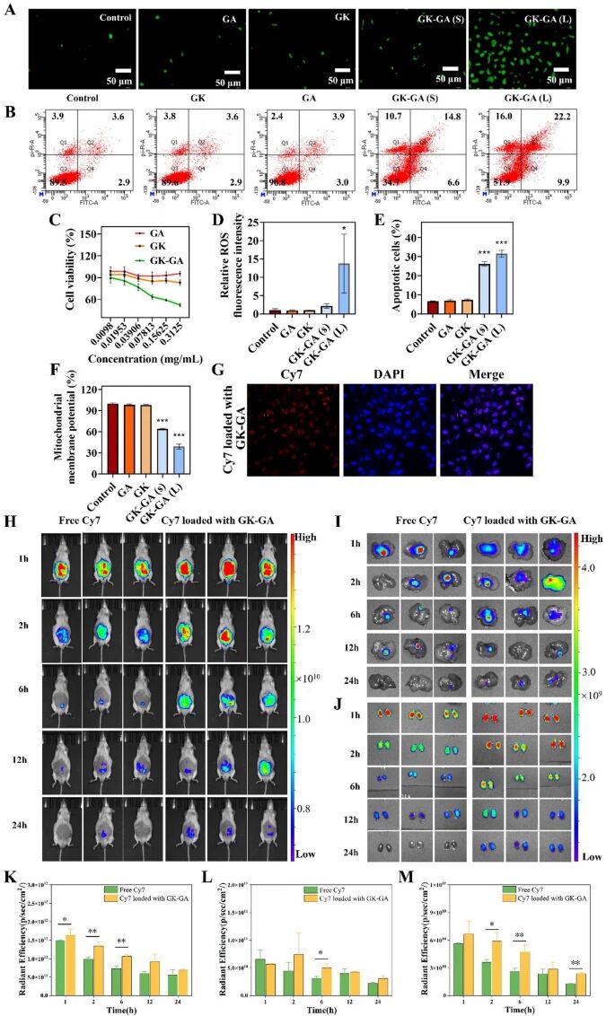 The GK-GA hydrogel does not require external carriers. It self-assembles into nanoscale structures through intermolecular interactions of active components in traditional Chinese medicine, possesses temperature-responsive injectable properties, and forms a drug reservoir in the abdominal cavity to prolong its action.