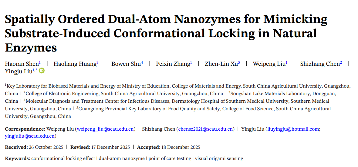 A spatially ordered Fe-Pd bimetallic nanozyme (o-FePd DAN) simulates substrate-induced conformational locking (SCL) through dynamic electronic coupling within the Cl-FeN3C-PdN3 sites. XAFS and DFT studies reveal a bridging structure-driven charge transfer pathway that effectively promotes adaptive regulation and selective catalysis, which is further applied to a POCT visual gene typing platform for HPV.