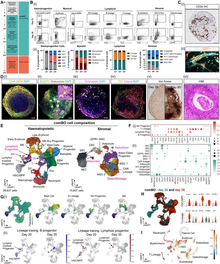 This study constructed a comBO organoid system, establishing an integrated platform based on induced pluripotent stem cells, capable of simultaneously generating osteocytes, blood vessels, lymphatics, and bone marrow compartments. By optimizing the microenvironment with specific scaffolds, the system achieves stable expansion and can maintain lympho-myeloid hematopoietic potential over the long term. It can also create chimeric models to simulate physiological and pathological bone marrow microenvironments, clarify disease-related key signals, and provide a high-fidelity in vitro model for basic research on the bone-bone marrow microenvironment.