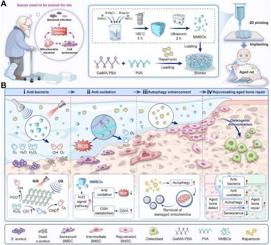 The decline in regenerative ability in elderly individuals is a core challenge in bone defect repair. In the aging microenvironment, excessive ROS, chronic inflammation, accumulation of senescent cells, and local infections mutually reinforce each other, forming a self-amplifying vicious cycle that severely hinders the healing process.