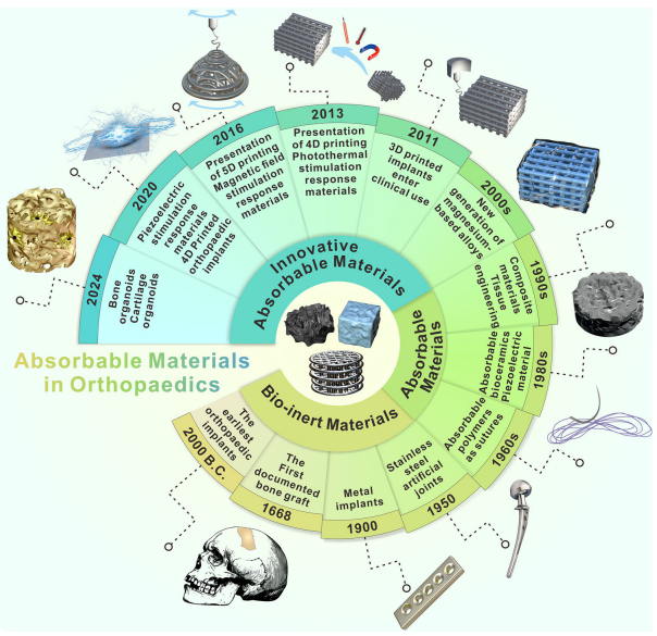 Absorbable materials are reshaping the future of orthopedic treatment. This review systematically outlines the evolutionary path from traditional bioinert materials to absorbable polymers, metals, ceramics, and their composites, focusing on the key challenge of synchronizing degradation rate with new bone regeneration. In terms of material design, the research highlights how composite strategies are used to leverage advantages and offset weaknesses: absorbable metals like magnesium and zinc provide mechanical support, natural polymers such as chitosan and hyaluronic acid impart bioactivity, and ceramics like β-TCP and hydroxyapatite induce osteogenesis, ultimately constructing an intelligent scaffold that can bear load in the early stage while gradually degrading in tandem with bone tissue growth.