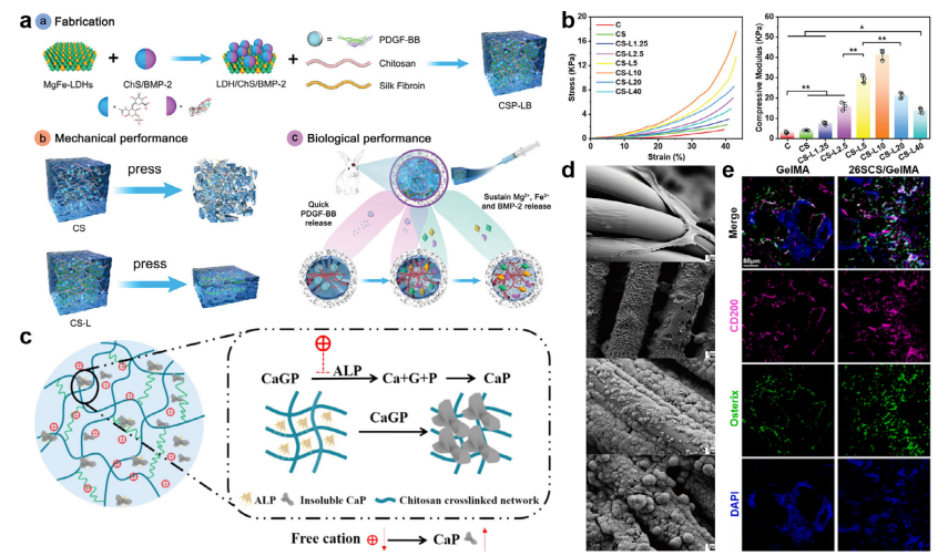 Chitosan-based absorbable materials for orthopedic applications. (a) Schematic diagram of CSP-LB hydrogel preparation and its functional mechanism. (b) Compression stress-strain curves (left) and compression modulus (right) of different samples. Reproduced with permission [173]. Copyright 2023, Wiley-VCH. (c) Schematic diagram of how the cationicity of chitosan hydrogel affects the mineralization yield.(d) SEM images of bone scaffolds before and after CAP treatment, as well as images after being soaked in SBF for 10 days. From top to bottom: pure CS, CS (CAP), CS/1.0 wt% HA, and CS/1.0 wt% HA (CAP). Reprinted with permission [176]. Copyright 2025, Elsevier. (e) Representative confocal images showing immunostaining of CD200 (purple) and Osterix (green), along with DAPI (blue) nuclear staining, in the femoral defect area of mice at 4 weeks post-surgery. Reprinted with permission [177]. Copyright 2021, Elsevier. Conductivity, antibacterial performance, hydrophilicity, and low immunogenicity [126, 170].