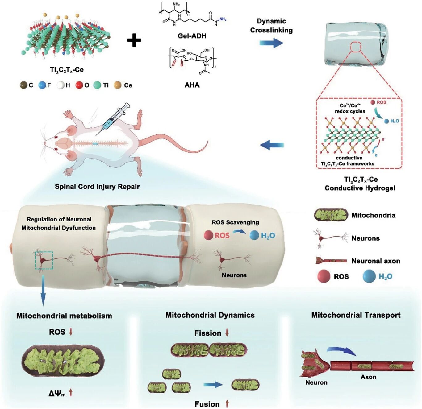 This study investigated a novel bioactive conductive Ti₃C₂Tₓ-Ce hydrogel (TCH) for the repair of spinal cord injuries. Spinal cord injury can lead to neuronal death, mitochondrial dysfunction, and a microenvironment enriched with reactive oxygen species, severely hindering axon regeneration. In this study, a multifunctional hydrogel system with enhanced antioxidant activity and conductivity was constructed through the coordination of cerium ions with Ti₃C₂Tₓ nanosheets.In vitro experiments show that this material can alleviate mitochondrial dysfunction and promote neuronal electrical activity; in vivo experiments indicate that it can inhibit astrocyte reactivity and promote dendritic structure and neuronal axon reconstruction. Its mechanism of action is related to the regulation of the PI3K/Akt-S6 signaling pathway. The relevant literature is published in the top materials science journal *Advanced Functional Materials*.