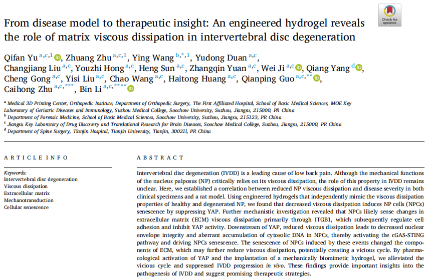 A study published in *Bioactive Materials* revealed the critical role and regulatory mechanisms of the viscoelastic dissipation properties of the extracellular matrix (ECM) in intervertebral disc degeneration (IVDD) by engineering hydrogels to mimic these properties. The research team first confirmed in clinical samples and rat models that the decrease in viscoelastic dissipation capacity of the nucleus pulposus tissue is positively correlated with the severity of IVDD. To explore the pathological significance of this mechanical property change, the team constructed two hydrogels with decoupled mechanical properties, simulating the viscoelastic dissipation levels of normal (V-gel) and degenerated (E-gel) nucleus pulposus. The results showed that even without changing the matrix stiffness, reduced viscoelastic dissipation alone could induce the senescence of nucleus pulposus cells (NPCs): cell spreading area decreased, proliferation capacity declined, senescence-associated β-galactosidase activity increased, accompanied by upregulation of senescence markers such as p16INK4a and γ-H2AX and increased secretion of SASP factors.